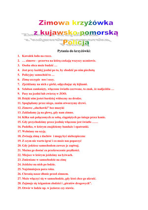 Policjanci w ramach akcji informacyjno-edukacyjnej pn. „Kręci mnie bezpieczeństwo w zimie” zachęcają dzieci mieszkające na terenie województwa kujawsko-pomorskiego do udziału w konkursie pn.: „Krzyżówka z kujawsko-pomorską Policją”. Na zwycięzców czekają nagrody.